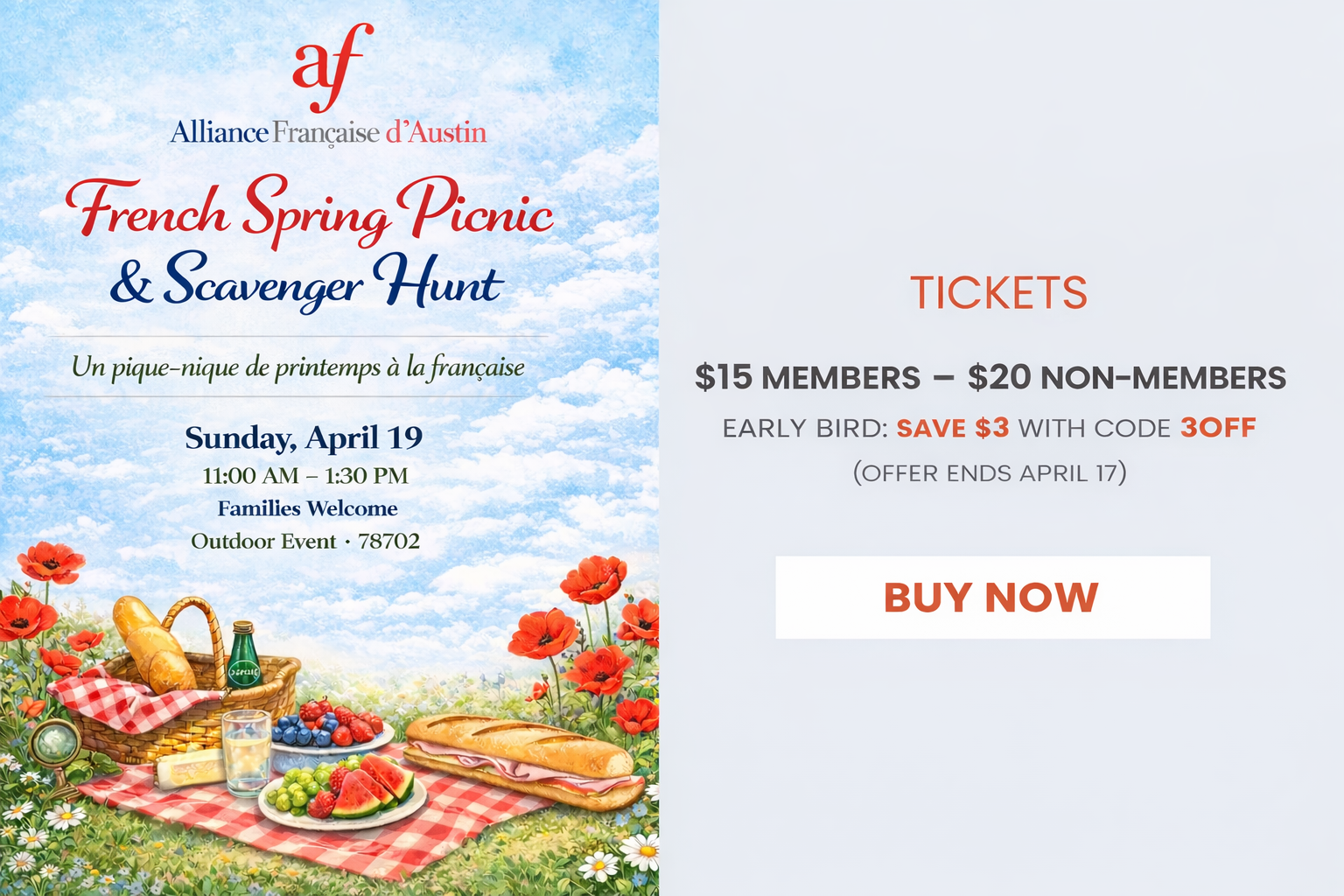 Immerse yourself in French and Francophone cultural events. We host regular events that include a Coffee and conversation, French movies with partnership with Austin Film Society, music festivals, book clubs, wine tastings, and much more.